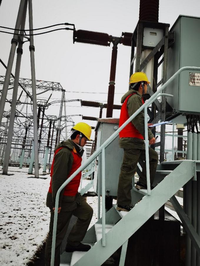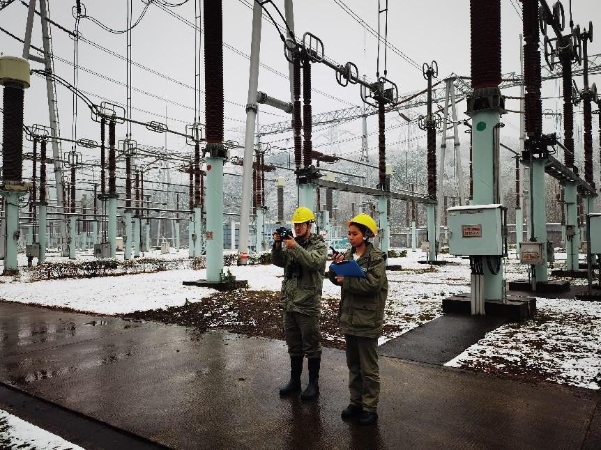 龍泉換流站運(yùn)維人員牛浩然、伍琛正在進(jìn)行雪后特巡,抄錄設(shè)備表計數(shù)據(jù)。廖瑋霖攝。