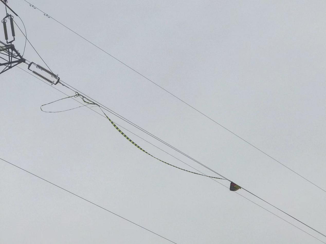 14時(shí)20分,兩人趕到平安區(qū)高鐵新區(qū),開始巡檢曹鐵二回。當(dāng)天是大風(fēng)天氣,狂風(fēng)呼嘯,吹打得人臉生疼?!安惶珜?,那里好像有東西?!崩钊珶j用望遠(yuǎn)鏡看到曹鐵二回3~4號塔段的線路上好像掛著東西。李全焜和佘超趕到異物搭掛現(xiàn)場仔細(xì)觀察后,發(fā)現(xiàn)是一個(gè)長風(fēng)箏掛在導(dǎo)線上,風(fēng)箏長約10米,至少搭掛了一側(cè),風(fēng)箏長尾的擺幅很大,如果再搭掛到線路另一側(cè),后果不堪設(shè)想,兩人立刻向輸配電運(yùn)檢中心匯報(bào)。