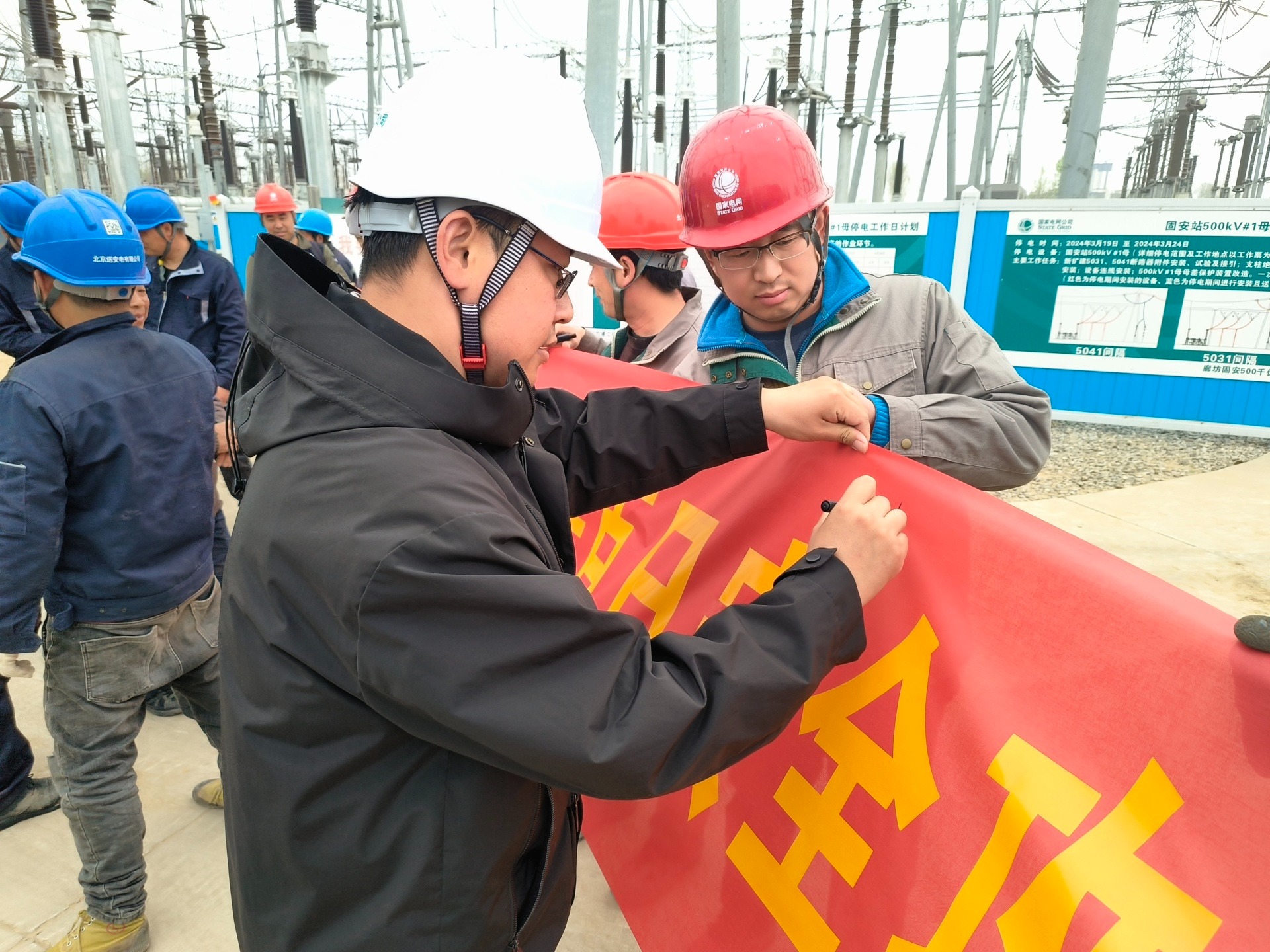 該公司負責建管的廊坊固安500千伏變電站擴建工程組織“百日安全攻堅行動”啟動儀式,全體參建人員在宣傳橫幅上簽字。王巖 攝