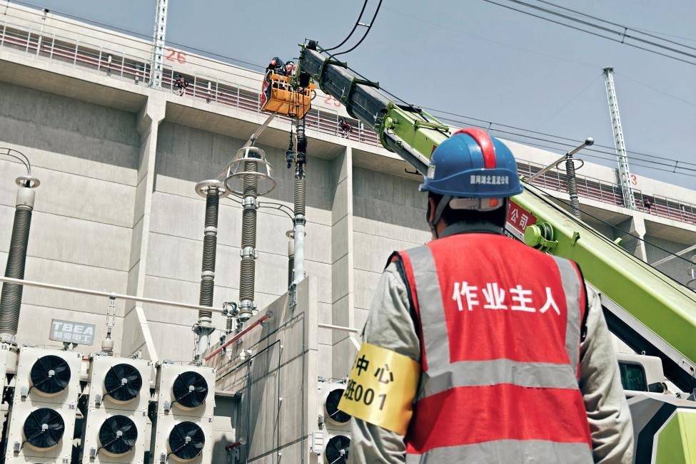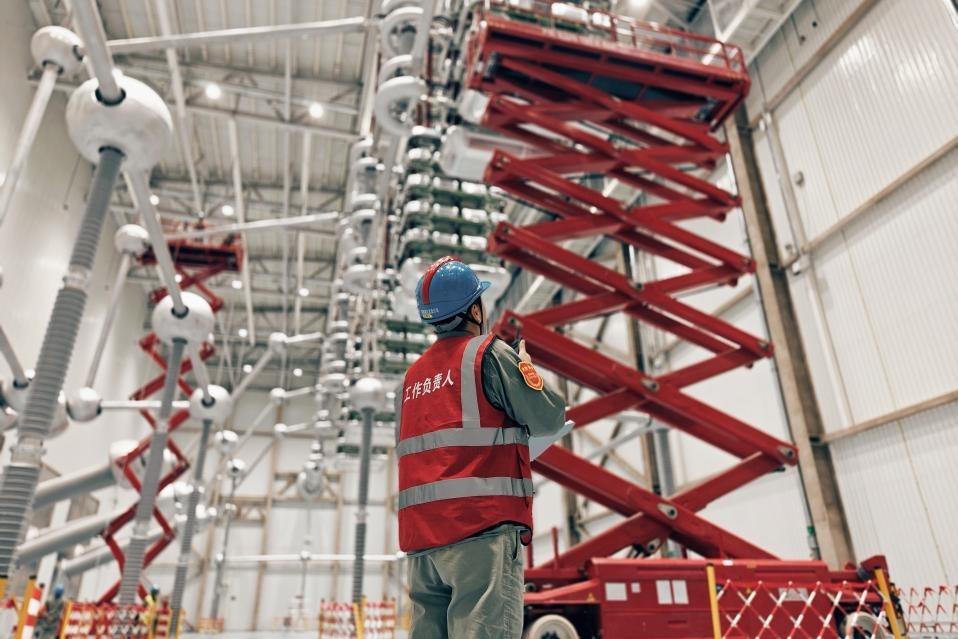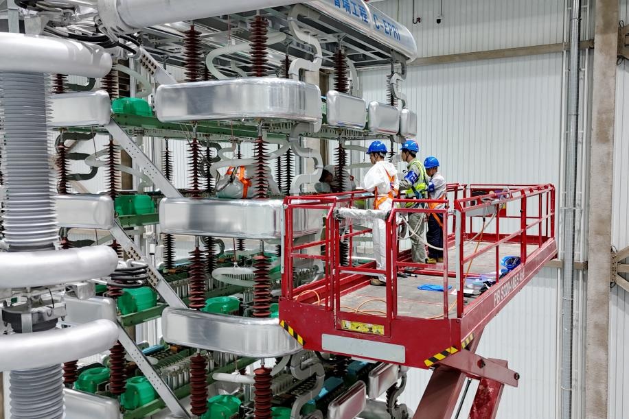 國(guó)網(wǎng)湖北直流公司特高壓檢修班高爭(zhēng)光和工作班成員在特高壓武漢換流變電站閥廳開(kāi)展換流閥電極檢查。周晨夢(mèng) 攝