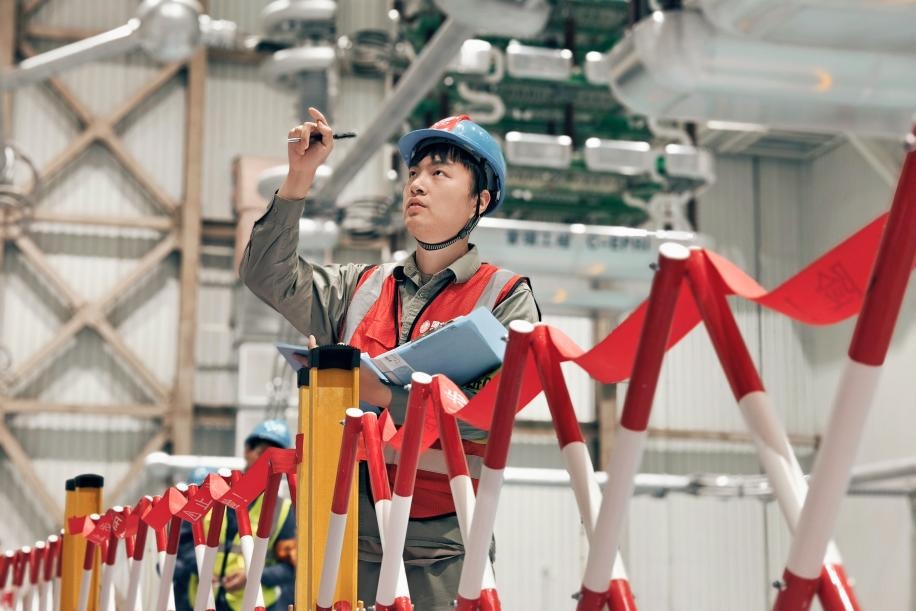 國(guó)網(wǎng)湖北直流公司一次檢修班鄒震在特高壓武漢換流變電站監(jiān)管換流變金具外觀檢查。歐陽(yáng)雷 攝