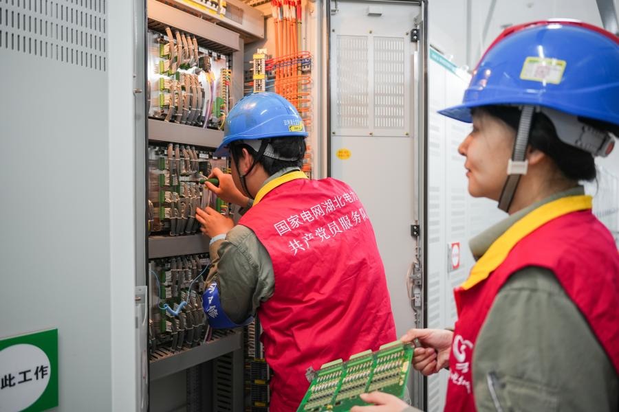 國(guó)網(wǎng)湖北直流公司特高壓檢修班劉云舒和二次檢修一班余鵬開(kāi)展交流濾波器接口屏板卡更換。周晨夢(mèng) 攝