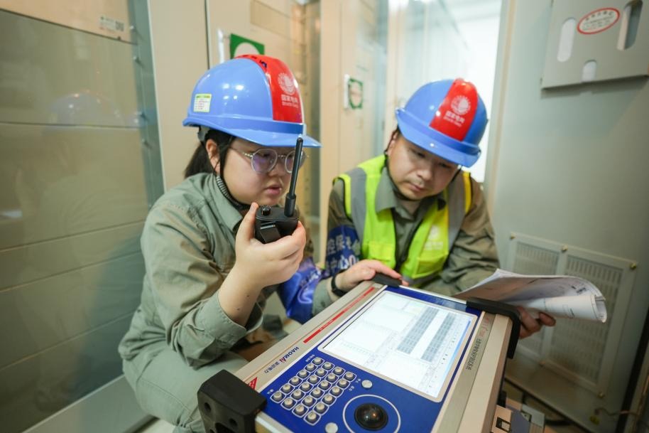國(guó)網(wǎng)湖北直流公司二次檢修一班班長(zhǎng)黃瑤玲帶領(lǐng)班員汪佳威進(jìn)行年度檢修期間現(xiàn)場(chǎng)培訓(xùn)。歐陽(yáng)雷 攝
