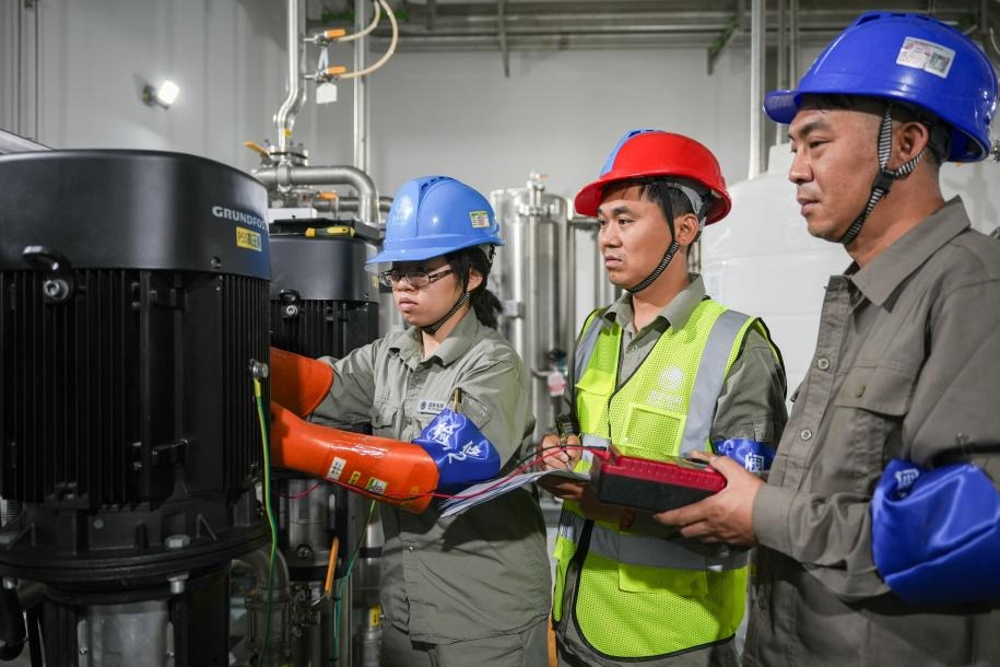 國(guó)網(wǎng)湖北直流公司機(jī)械檢修班班長(zhǎng)饒洪林和特高壓檢修班李喆在特高壓武漢換流變電站閥冷設(shè)備室進(jìn)行高壓泵電機(jī)絕緣測(cè)量。凌雨萌 攝