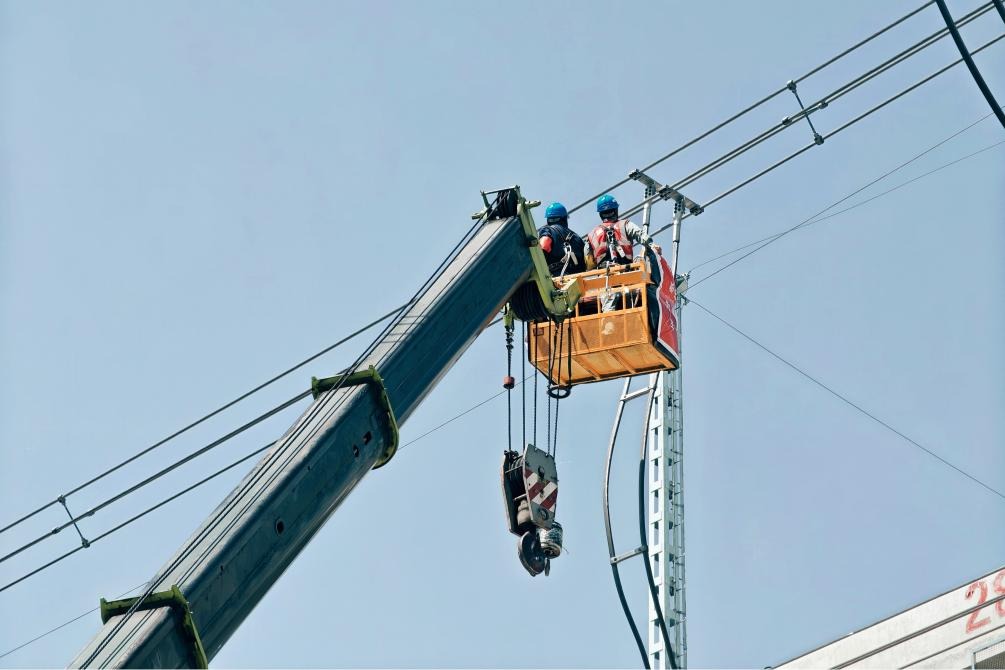 頂著烈日,在吊車(chē)小斗里監(jiān)管人鄒震也一刻不敢放松,確保施工人員安全高效開(kāi)展工作。