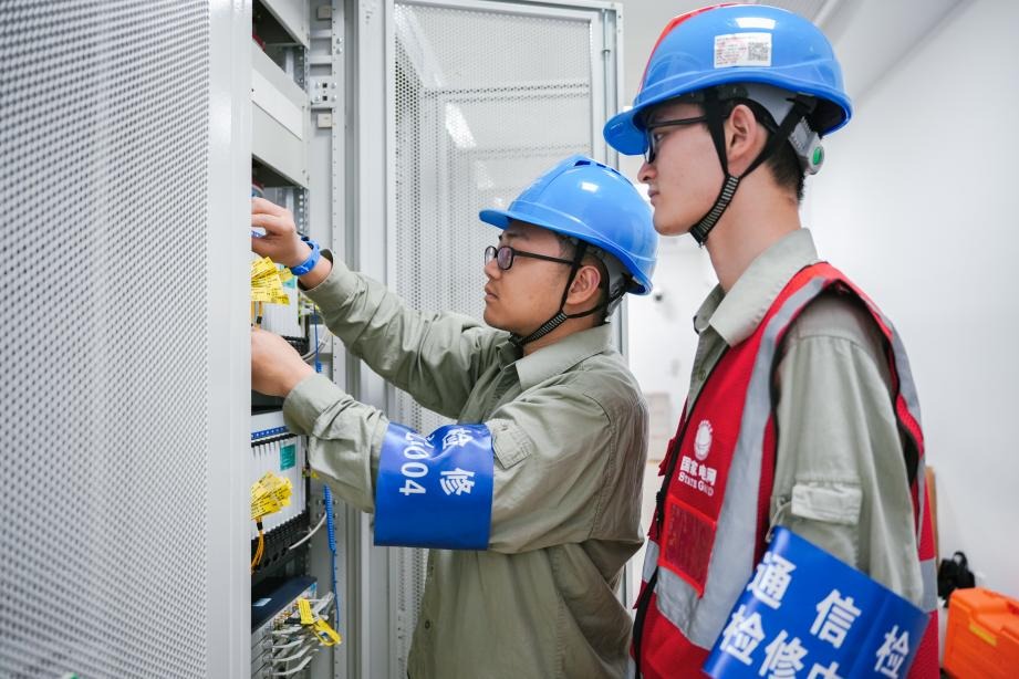 國(guó)網(wǎng)湖北直流公司信通運(yùn)檢班呂鑫瀧和胡江山在特高壓武漢換流變電站通信機(jī)房進(jìn)行通信傳輸設(shè)備檢查。凌雨萌 攝