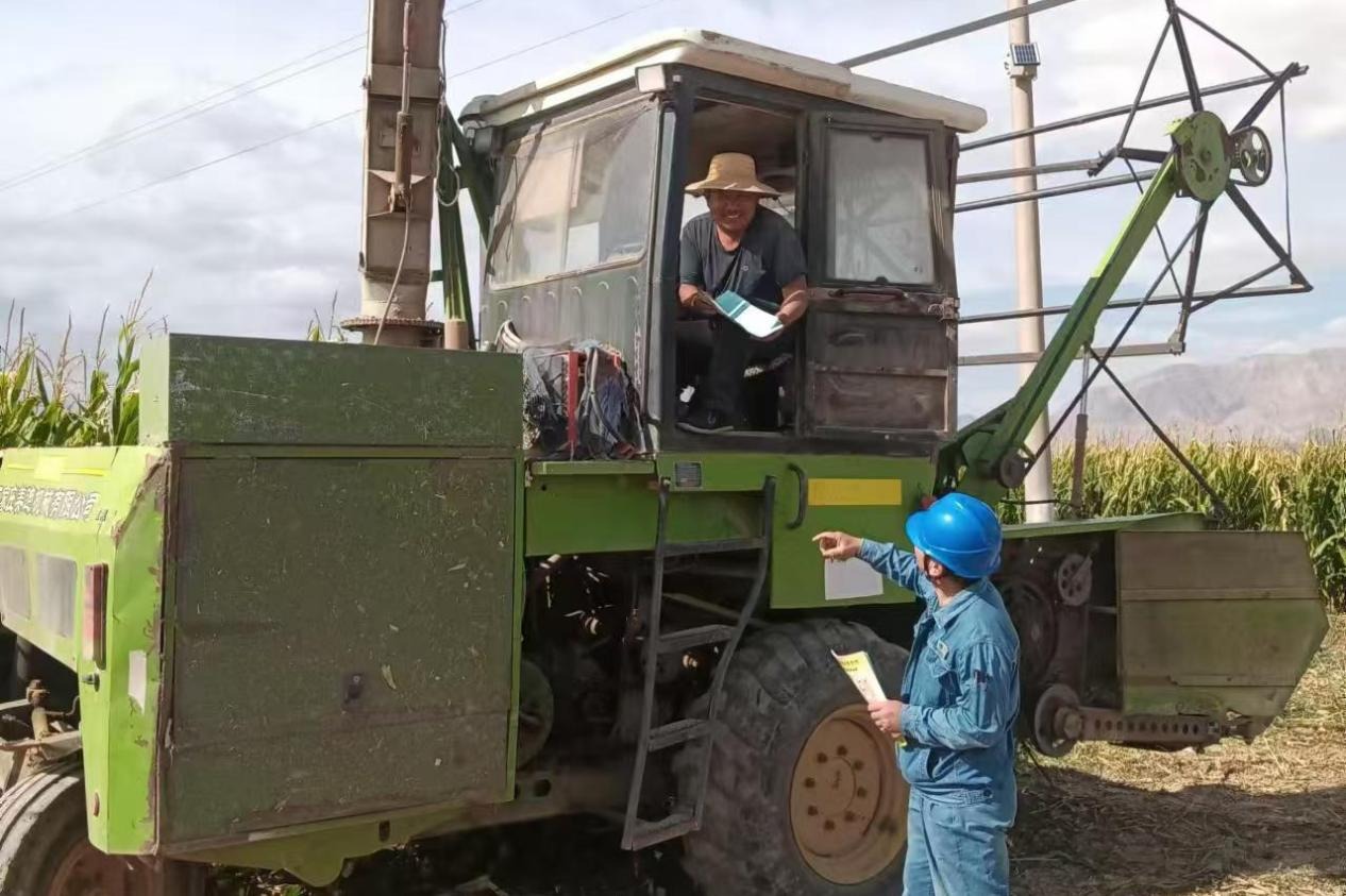 中國(guó)能源新聞網(wǎng)訊(雷波)“師傅,在收割的時(shí)候一定要注意與電力設(shè)施保持足夠的距離,有問(wèn)題及時(shí)與我們聯(lián)系,這是防外破、防人身傷害宣傳單,麻煩你抽時(shí)間認(rèn)真學(xué)習(xí)?!?月9日,國(guó)網(wǎng)甘肅張掖甘州區(qū)供電公司工作人員走進(jìn)青儲(chǔ)收割現(xiàn)場(chǎng)開(kāi)展青儲(chǔ)收割防外破防人身傷害宣傳,確保供電轄區(qū)內(nèi)配電設(shè)備平穩(wěn)可靠運(yùn)行。
