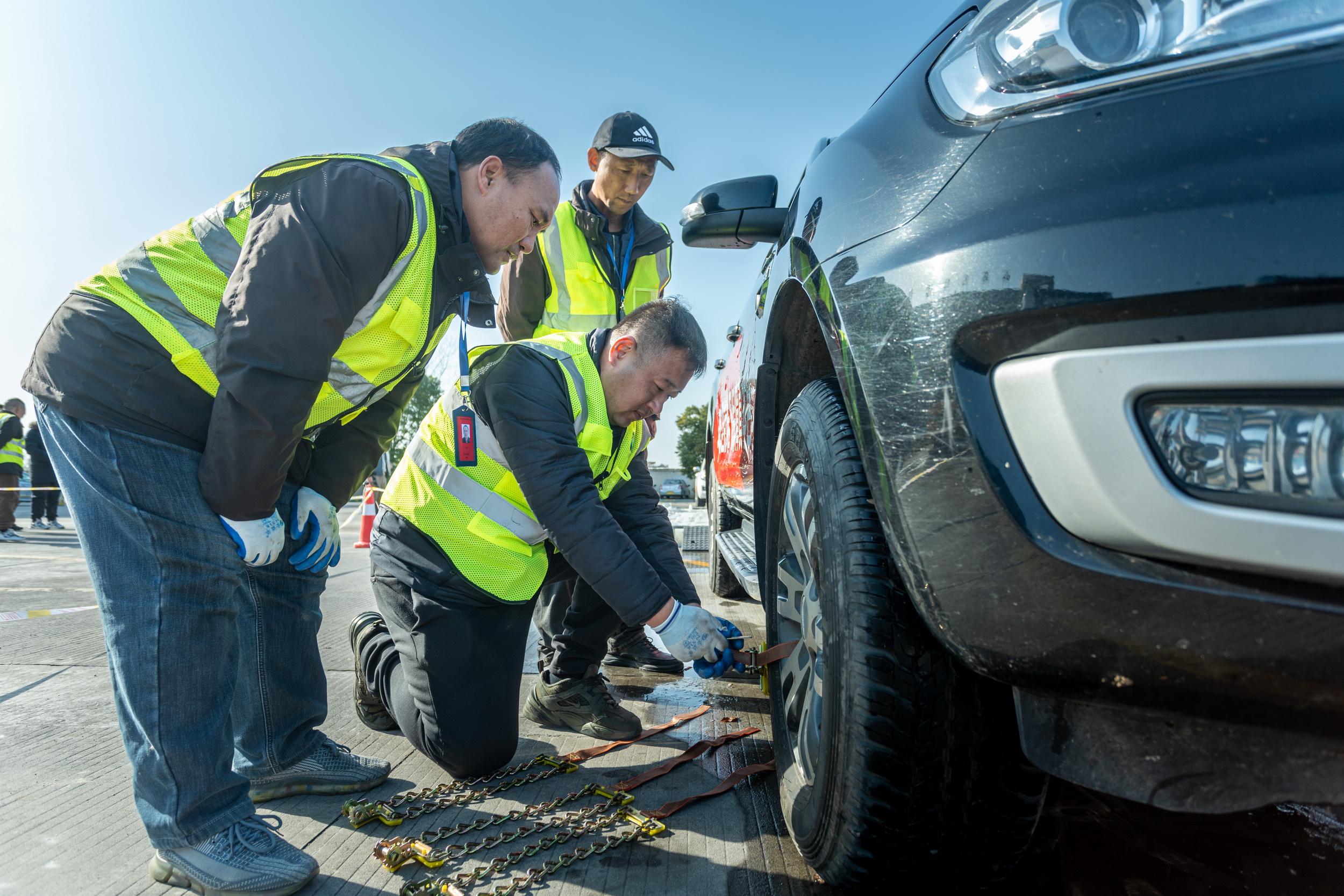 不到10分鐘,在專業(yè)老師的指導(dǎo)下,盧毅便給兩個(gè)輪胎安裝好了兩條銀色的兩根手指粗細(xì)的防滑鏈條。它們像是被披上了兩件銀色堅(jiān)固的盔甲,在陽(yáng)光的照耀下,格外亮眼。