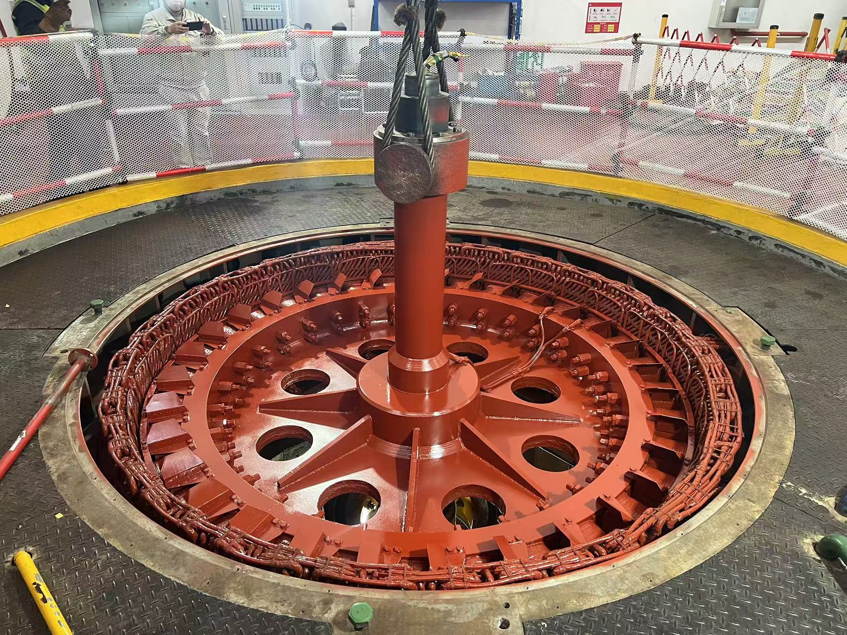 為確保轉(zhuǎn)子能夠順利回裝,回裝前,該公司組織召開動員會,從工作流程、人員分工、安全措施、安全交底等方面進(jìn)行精心部署和周密安排,明確回裝程序、進(jìn)行危險點(diǎn)分析、對安全注意事項提出具體要求,全面核查回裝前各項準(zhǔn)備工作,做到萬無一失。在操作、指揮等專業(yè)技術(shù)人員的密切配合下,經(jīng)過50多分鐘的緊張作業(yè),轉(zhuǎn)子平穩(wěn)落入機(jī)坑,整個回裝工作順利完成。