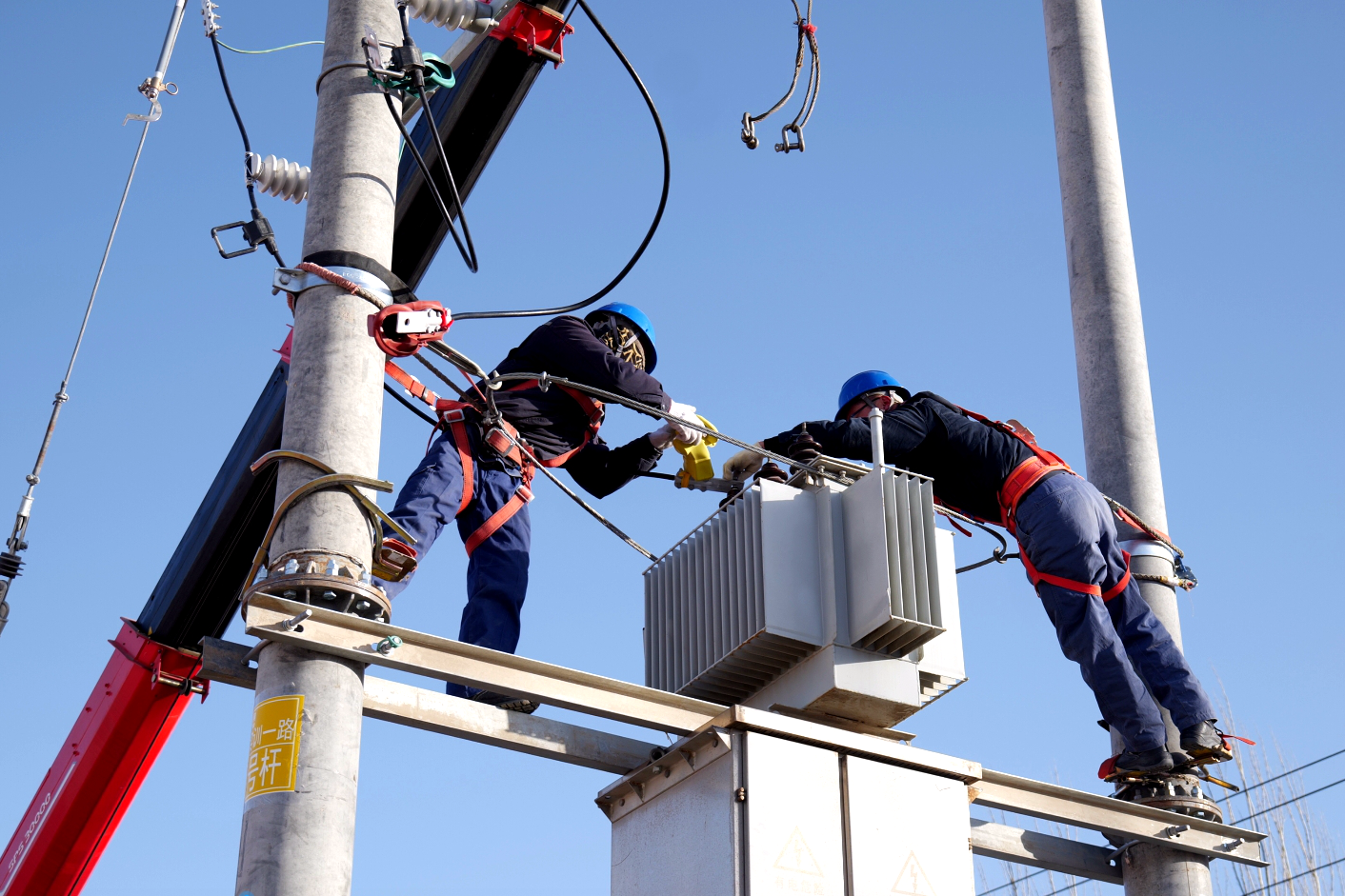 “現(xiàn)在大家看到的是演練科目三:配網(wǎng)安裝第一階段。在配網(wǎng)搶修現(xiàn)場(chǎng),目前導(dǎo)線安裝已完成,搶修人員正在指揮吊車吊裝柱上變壓器的工作……”隨著解說員的話音,大屏上出現(xiàn)相應(yīng)的畫面,搶修人員對(duì)變壓器進(jìn)行專業(yè)檢測(cè),利用繩索工具和吊車將變壓器起重至安裝位置,高空作業(yè)人員固定安裝、線路接入、更換刀閘,完成作業(yè)。