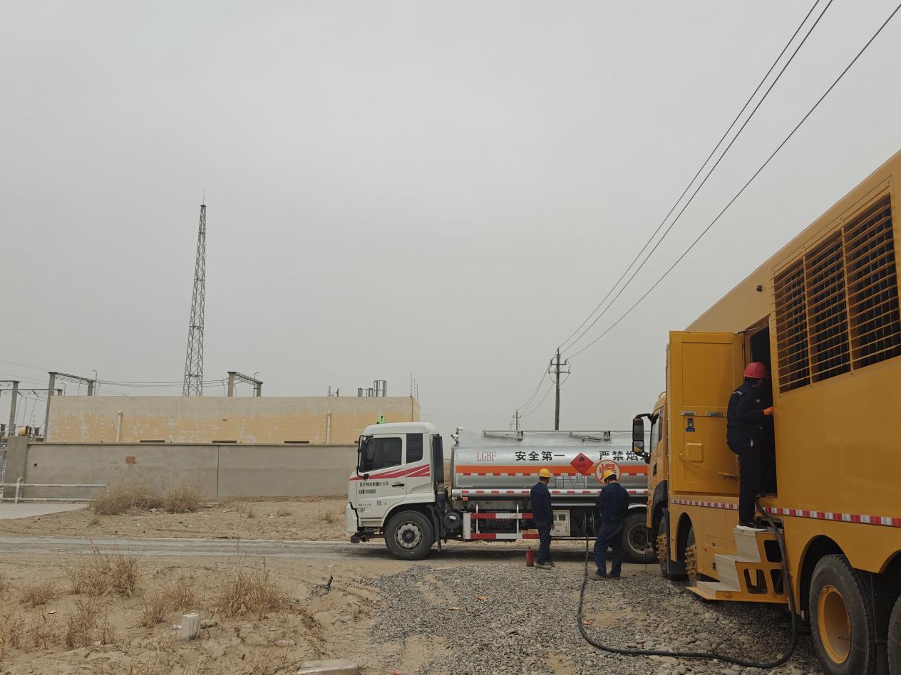4月12日,民豐縣35千伏紅柳變保電現(xiàn)場,工作人員操作油罐車給10千伏應(yīng)急電源車加油。黃欣元 攝