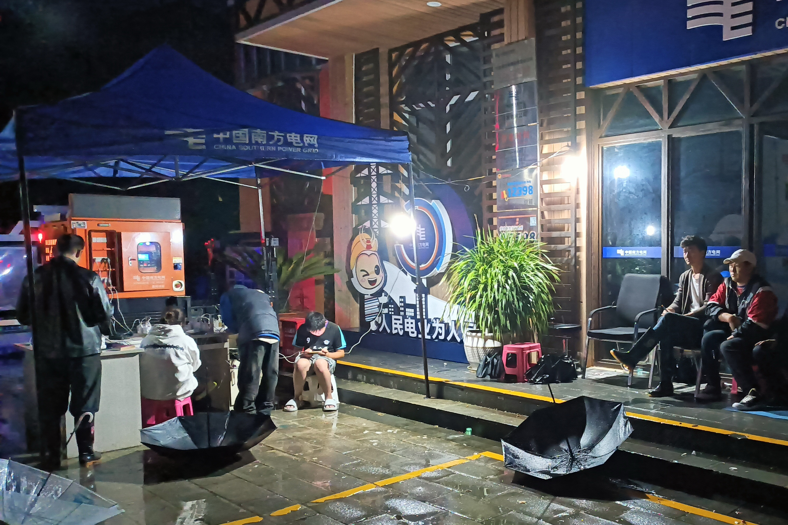 電力搶修人員設(shè)置便民服務(wù)點(diǎn)為村民提供照明、充電等服務(wù)。南方電網(wǎng) 供圖