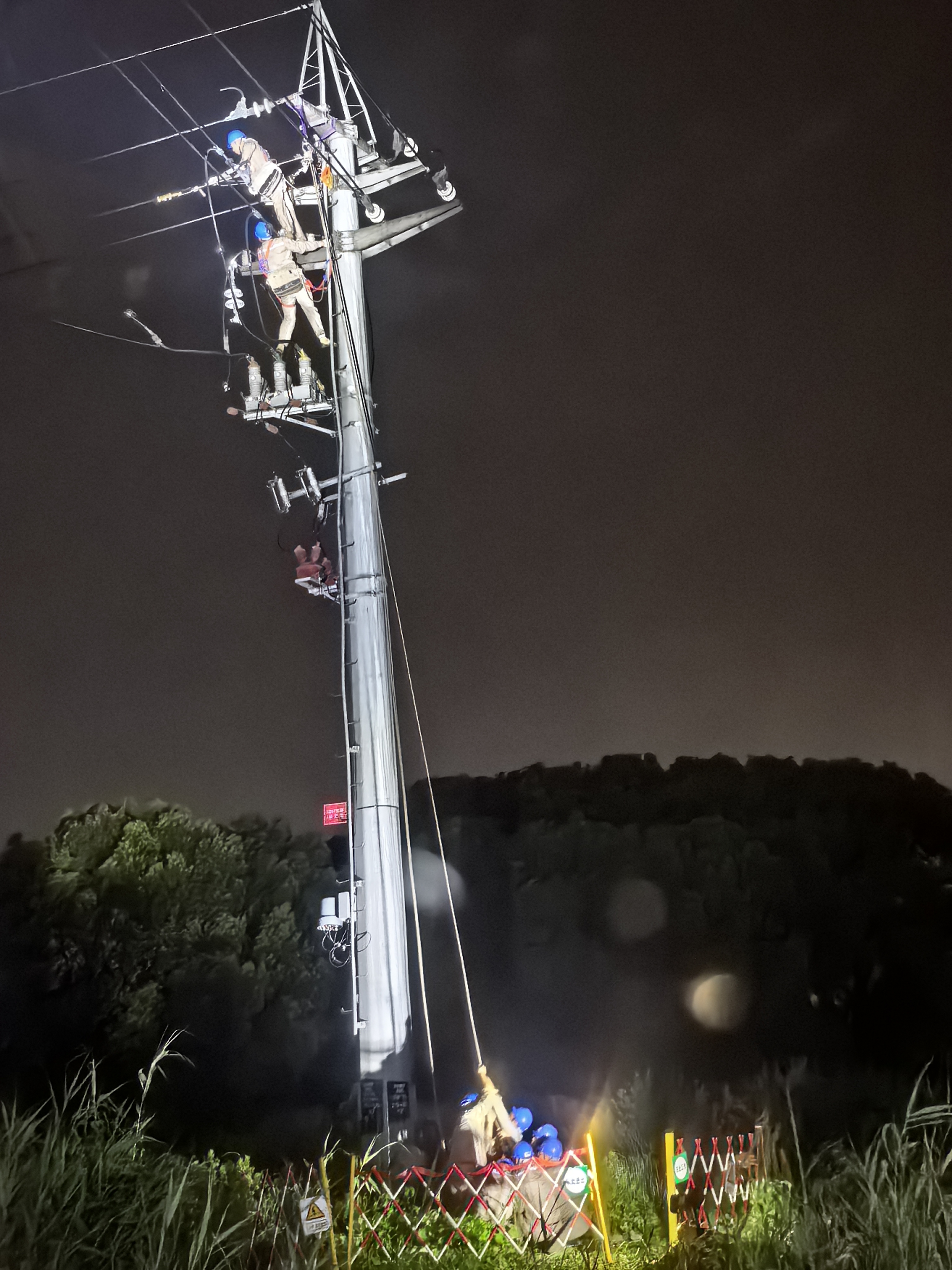 “夜晚雨天作業(yè),上下桿大家一定要注意安全?!睋屝奘┕ぶ鞋F(xiàn)場安全監(jiān)護(hù)人員時(shí)刻提醒施工人員。搶修人員按規(guī)范要求做好各項(xiàng)安全措施,拉起警戒線、掛設(shè)接地線;分工明確后配合默契,并對周邊區(qū)域進(jìn)行嚴(yán)格的安全風(fēng)險(xiǎn)管控。搶修人員頂風(fēng)冒雨,歷時(shí)5個(gè)小時(shí)鏖戰(zhàn),于7月31日2時(shí)17分完成搶修搶施工任務(wù),此次搶修施工完成更換懸瓷耐張4串,收線、緊線4處,柱開引下搭接一臺,完成直線桿導(dǎo)線一相綁扎。配合帶電作業(yè)裝設(shè)、拆除接地線三組。出動人員16 人、工程車輛5輛