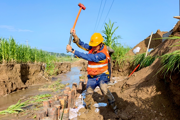 “鐺!鐺!”打樁錘聲撕裂曠野。一組組長李祥緊盯水平儀,泥漿覆蓋的臉上汗如雨下。雨后地面酥軟如棉,每根兩米長的松木樁都需經(jīng)受數(shù)十次重錘方能站穩(wěn)。隊(duì)員們的膠鞋深陷泥潭,每拔一步都帶起大坨淤泥,臨時木板在泥漿中難以固定,只能靠大家肩扛手推挪位。九點(diǎn)整,當(dāng)最后一根木樁被穩(wěn)穩(wěn)砸進(jìn)土里時,李祥才松了口氣。百余根松木樁沿著坑邊圍成一個整齊的圓圈,像一圈忠誠的衛(wèi)兵,將搖搖欲墜的坑體牢牢箍住。他掏出手機(jī)看了眼時間,比預(yù)計提前了半小時,嘴角忍不住向上揚(yáng)了揚(yáng)。
