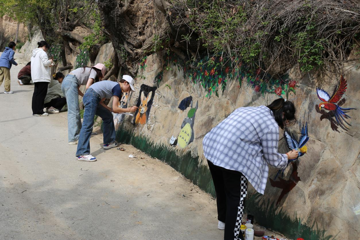 “我們的藝術(shù)實踐要以山水花鳥為主,西和縣這邊的山體和我們?nèi)ツ陮懮鷮嵺`的太行山山體結(jié)構(gòu)有著明顯的區(qū)別,大家對各地山勢的認(rèn)知程度也會有相應(yīng)的區(qū)別,同學(xué)們用毛筆畫的技法就會有明顯區(qū)別......。這是一次很好的機(jī)會,讓大家親身體會這些不同,欣賞不用的風(fēng)景,感悟別致的文化習(xí)俗,了解目前鄉(xiāng)村發(fā)展的現(xiàn)狀和存在的問題,了解到鄉(xiāng)村振興工作的重要意義和給鄉(xiāng)村帶來的變化。只有這樣用心去感悟,融情于景,才能讓我們進(jìn)一步提高自己的繪畫水平。”帶隊老師一邊向駐村干部介紹,一邊指導(dǎo)學(xué)生李慧玲用畫筆將圍欄與野菊菌的故事畫在墻上。