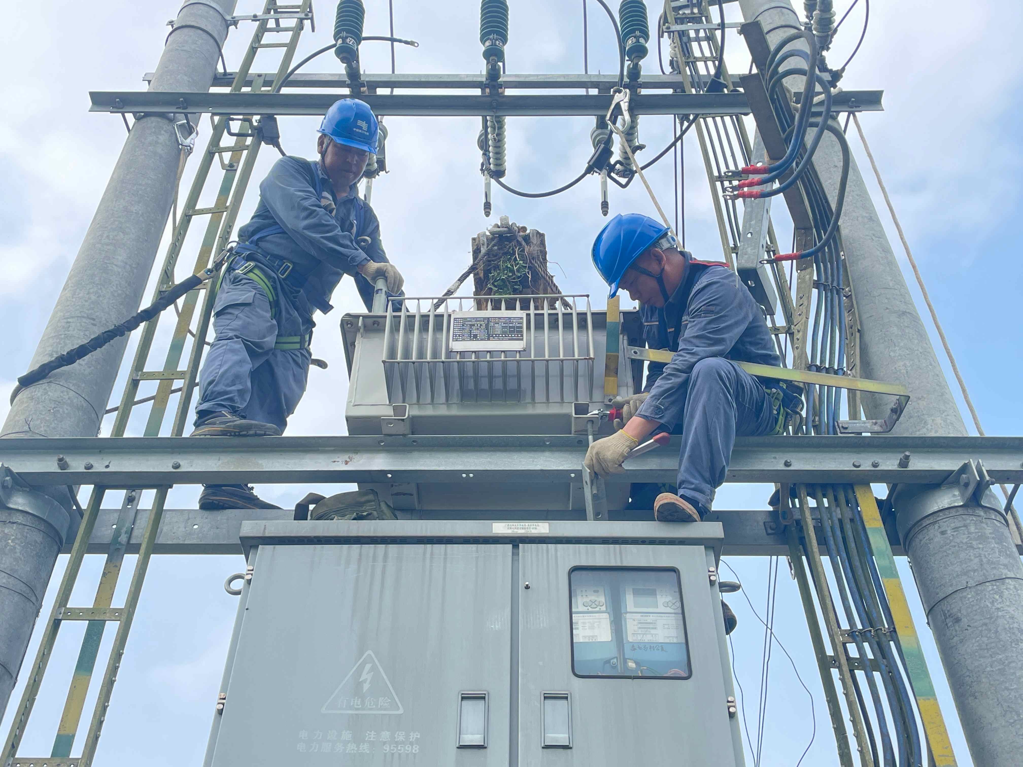 4月26日,南方電網(wǎng)廣西來賓興賓供電局工作人員更換因暴雨受損的變壓器。熊慶形 攝