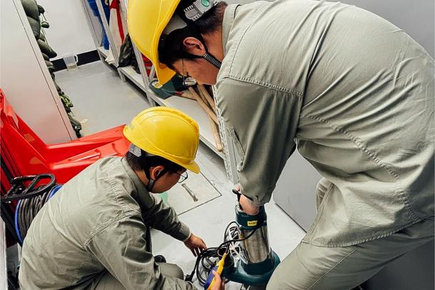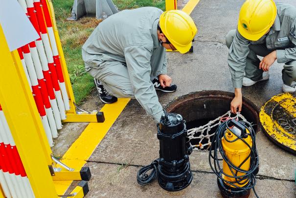6月27日,國網湖北直流公司宜昌換流站運維人員唐越和馮振東對潛污泵進行外觀檢查。彭玉龍 攝