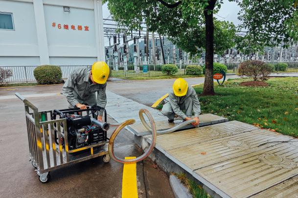 6月28日,國網湖北直流公司龍泉換流站運維人員牛浩然和甘瑋在使用柴油泵排水。伍琛 攝