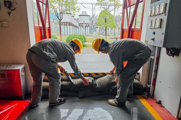 6月28日,國網湖北直流公司龍泉換流站運維人員牛浩然和甘瑋在工業(yè)泵房堆防汛沙包。伍琛 攝