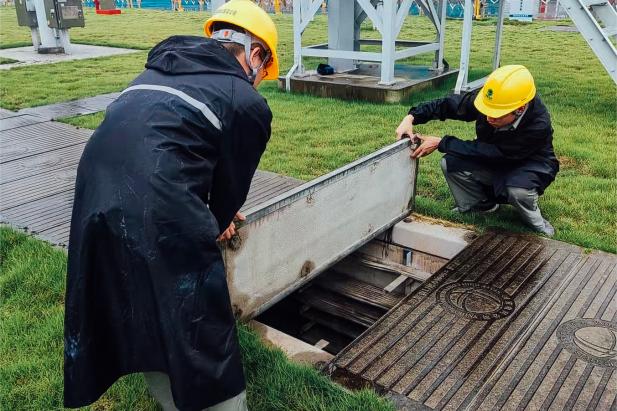 6月28日,國網湖北直流公司龍泉換流站運維人員牛浩然和甘瑋正在檢查排水管道。伍琛 攝