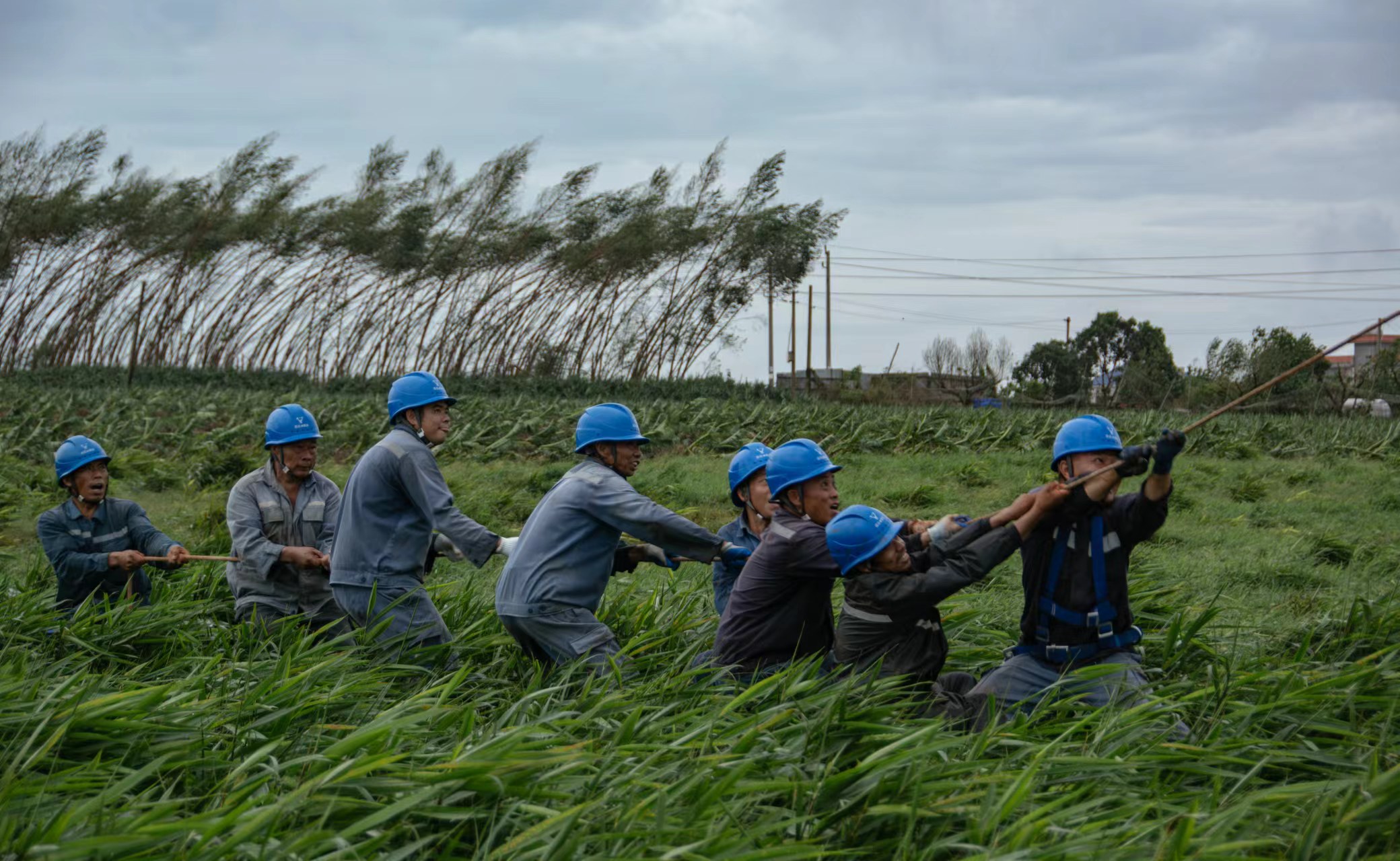 9月8日,在湛江雷州,廣東電網(wǎng)能源發(fā)展公司的搶修人員在現(xiàn)場簡單席地就餐,為搶修復電爭取更多時間。(陳海東 攝)