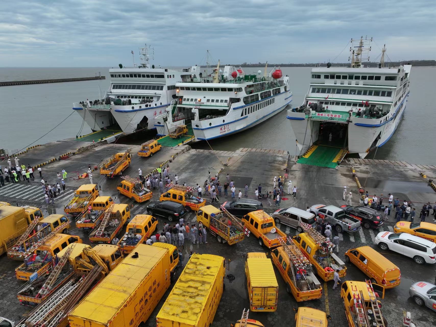 9月7日,臺風“摩羯”登陸后,南方電網(wǎng)首批支援隊伍在徐聞海安新港乘渡輪過海,全力支援海南搶修復電。(吳美芬 李志杰 攝)