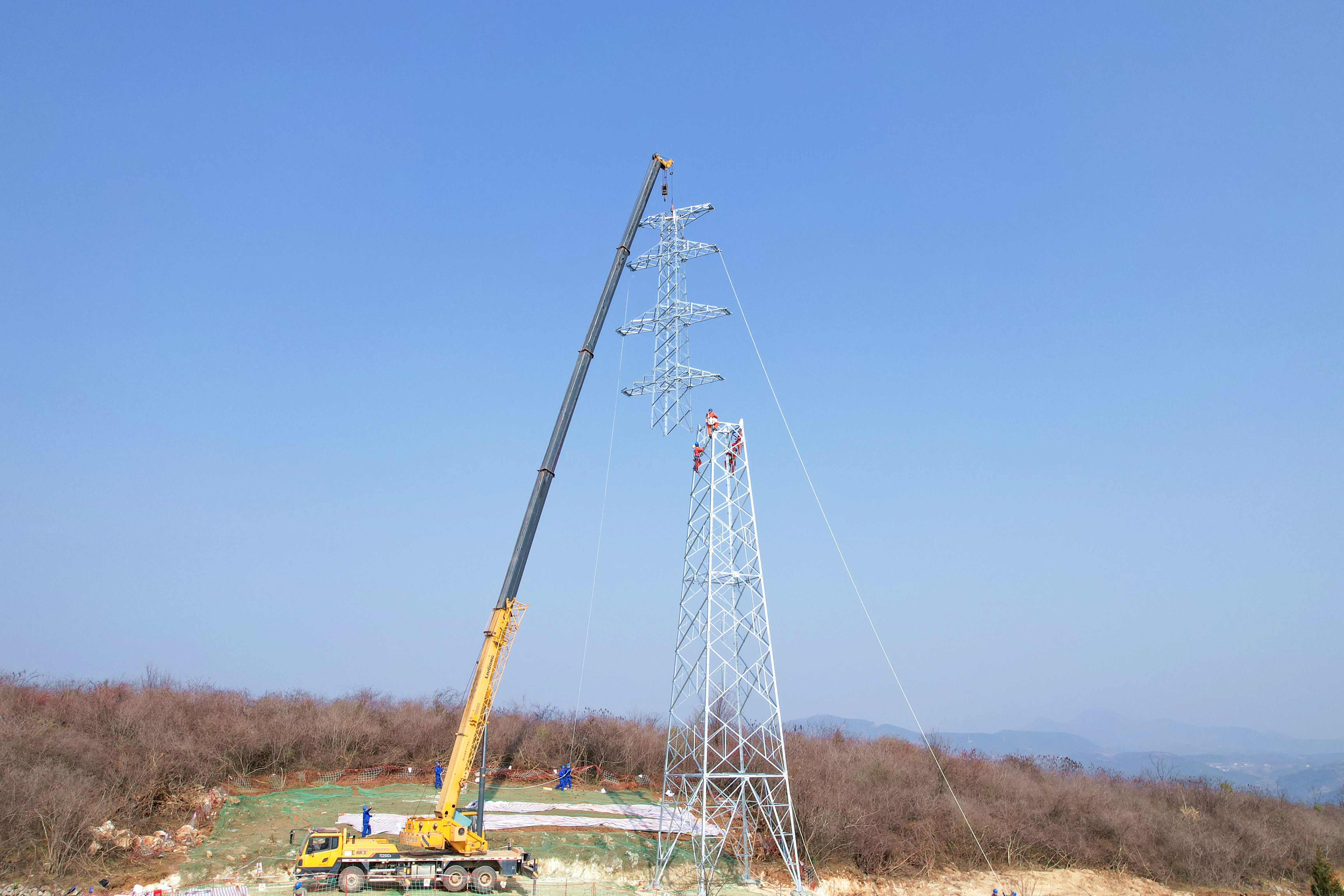 “機(jī)械化施工周期短,能精準(zhǔn)控制安裝精度,工程質(zhì)效得到提升?!壁w永領(lǐng)介紹,工程新建107基鐵塔,包括11基雙回路耐張塔、36基單回路耐張塔,鐵塔平均呼高28.8米,最高達(dá)45米。依托機(jī)械化工法,共組織5個(gè)立塔班組,以3天/基的效率推進(jìn),全方位保障工程按里程碑節(jié)點(diǎn)完工。