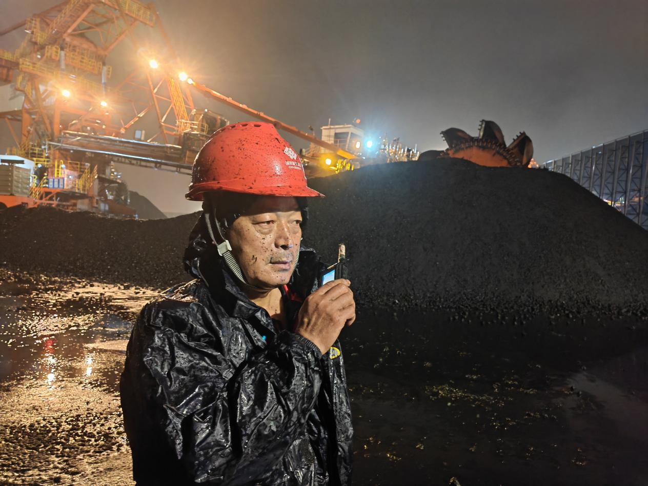 國家能源集團銷售集團一線員工在港口現(xiàn)場溝通煤炭裝船作業(yè)情況。
