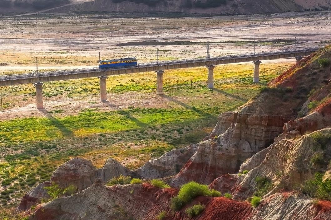 夕陽似火,余暉灑在鐵路橋上,火車在金光中前行,遠(yuǎn)處的沙丘與近處丹霞似彩繪,色彩交織熱烈奔放。梁逾華 攝