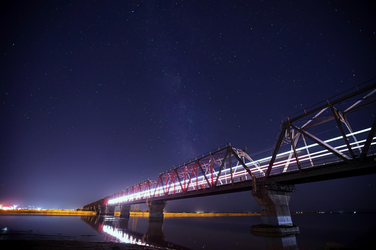 群星璀璨之下,包神鐵路黃河大橋橫跨兩岸,列車疾馳而過,劃出絢麗光軌,構(gòu)成壯美畫卷。楊國強(qiáng) 攝