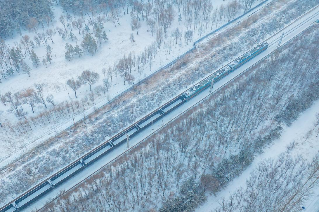 雪過天晴,鋼鐵巨龍?jiān)阼F路橋上穩(wěn)步前進(jìn),溫暖的陽光如同金色的紗幔披在它身上,壯美如畫。李尚昆 攝