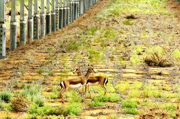 鵝喉羚屬于國家二級保護(hù)動物,以青草等植物為食,因種群數(shù)量稀少被列入中國《國家重點保護(hù)野生動物名錄》和《世界自然保護(hù)聯(lián)盟(IUCN)瀕危物種紅色名錄》。近年來,國能龍源電力在寧夏騰格里沙漠新能源基地實施“綠色能源+生態(tài)治理”開發(fā)模式,通過設(shè)置立體防沙障、鋪設(shè)草方格、播撒草籽,栽植灌木等方式防沙治沙,使這片曾經(jīng)風(fēng)吹沙跑的沙漠植被覆蓋率從0.5%增加至15%~20%,為野生動物提供了食物充足、蔭涼遍地的新棲息地,吸引了鵝喉羚、鴿子等眾多野生動物前來覓食,推動區(qū)域生態(tài)環(huán)境持續(xù)向好。