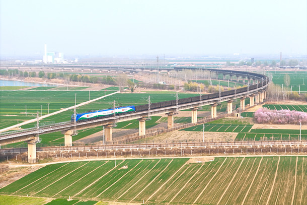 圖為朔黃鐵路“國能號”列車馳騁在華北平原。