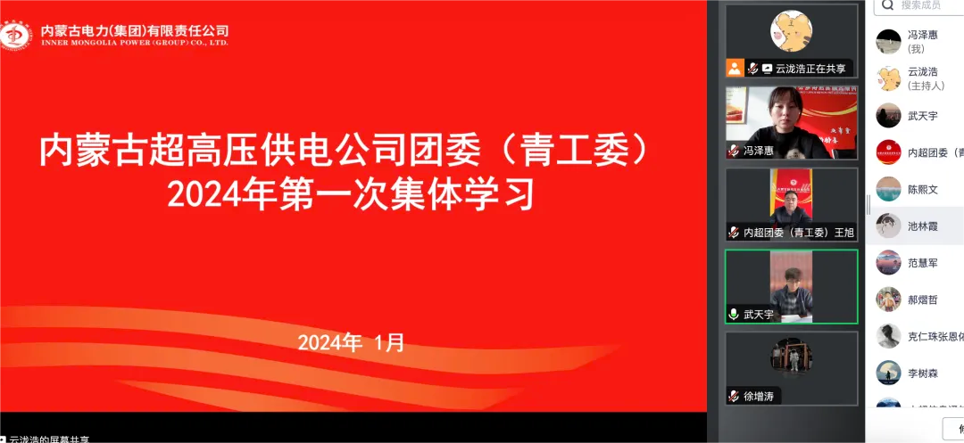 近日,內蒙古電力集團內蒙古超高壓供電公司團委(青工委)采用線上視頻的形式組織進行2024年第一次集體學習。該公司團委(青工委)直屬團支部(青工委)書記、副書記及支部委員共計40余名團干部參加了學習。