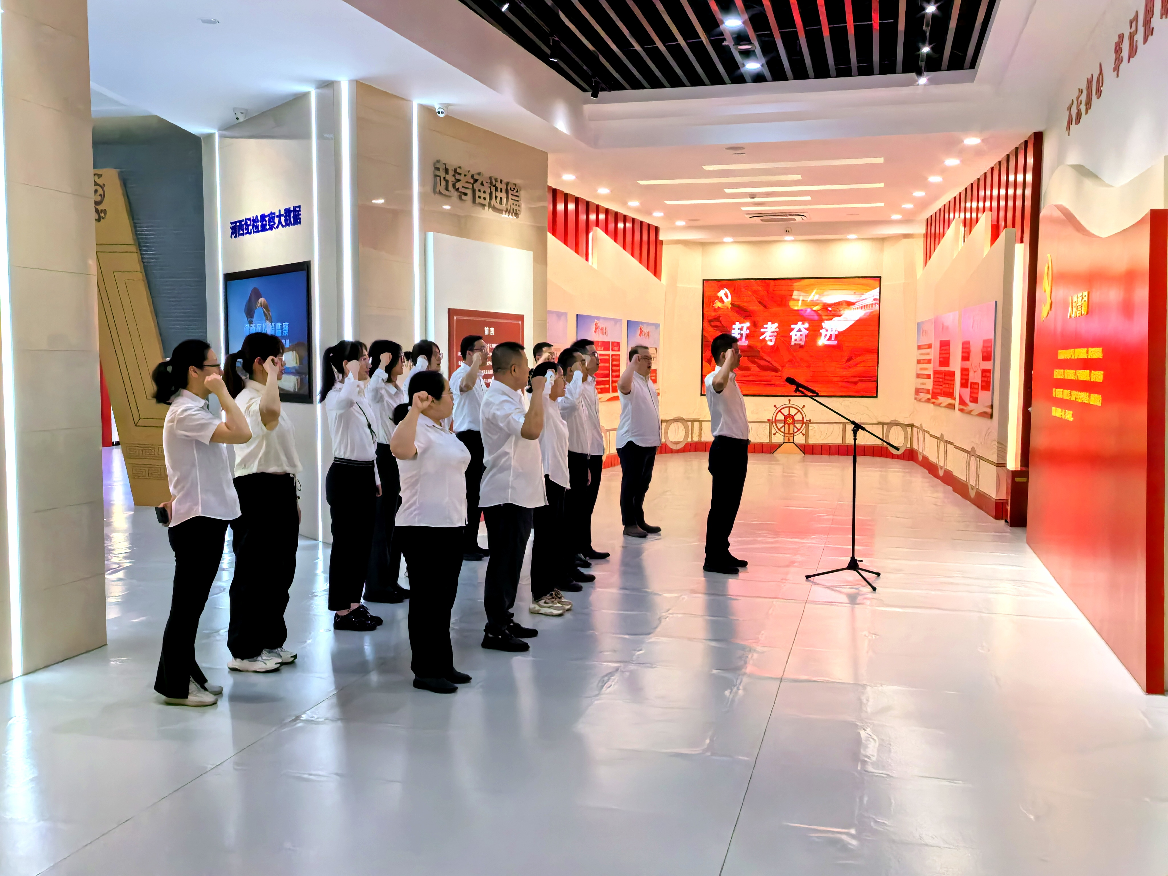 專題展分為序廳、紀律發(fā)展、全面從嚴、河西實踐、警鐘長鳴、廉潤初心、趕考奮進共7個展廳,通過視頻、文字、圖片、雕塑等多種形式,回顧了中國共產黨百年紀律建設的歷史進程、新時代全面從嚴治黨取得的歷史性成就以及天津市河西區(qū)管黨治黨、正風肅紀反腐的成功實踐,運用正反兩方面典型,用身邊事教育身邊人,筑牢干部思想防線。參觀結束后,中水物資天津公司黨員重溫入黨誓詞,感悟初心使命、提升黨性修養(yǎng)。