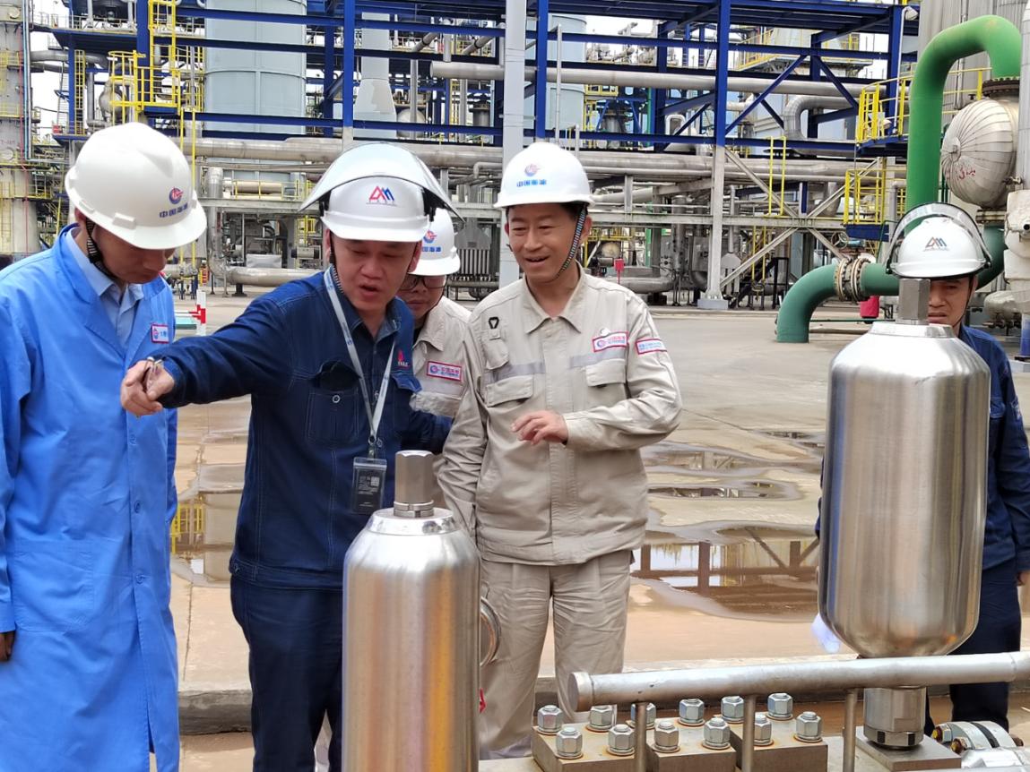 劉付華同技術(shù)人員討論對(duì)裝置流程進(jìn)行優(yōu)化。