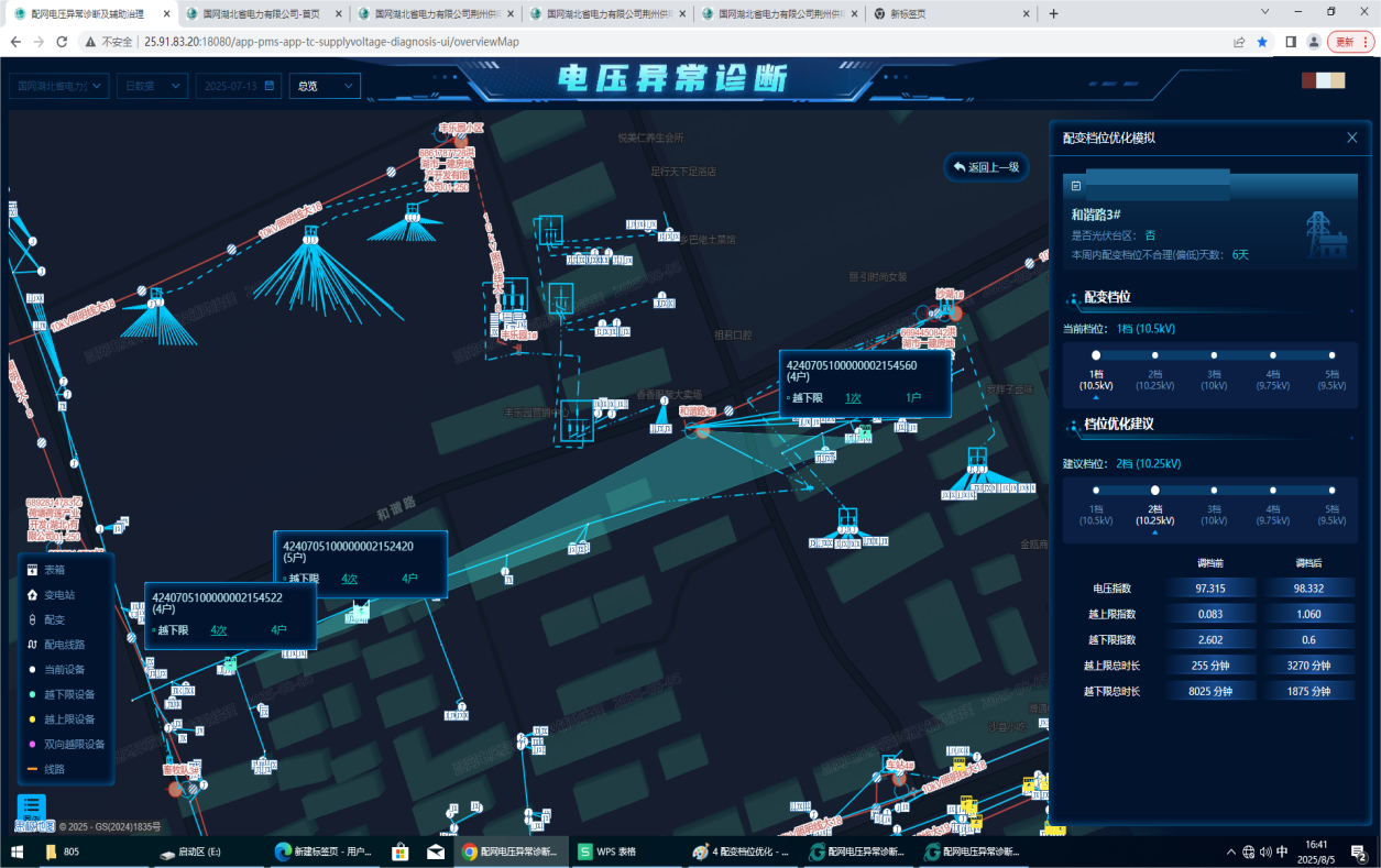 基層配網(wǎng)電壓治理工作因長期缺乏精準、快速的電力系統(tǒng)穩(wěn)態(tài)分析能力支撐,各級員工難以系統(tǒng)性掌握電壓異常根因,對電壓越限問題無法有效根治。國網(wǎng)湖北省荊州市供電公司基于“電網(wǎng)一張圖”,應(yīng)用設(shè)備、用戶、拓撲、運行數(shù)據(jù),貫穿站、線、變、戶四個層面,基于電力系統(tǒng)穩(wěn)態(tài)分析原理做深做實計算推演能力,以95.7%的準確率補全配網(wǎng)各環(huán)節(jié)壓降、無功等電氣量,真實還原單相用電用戶相別、91.5%的配變檔位,得出三相負載平衡、配變檔位設(shè)置、母線電壓分時段控制等8類運維策略,生成線路改接、無功補償?shù)?類網(wǎng)改策略,強化低壓戶箱、戶變關(guān)系不一致等5類數(shù)據(jù)質(zhì)量校核規(guī)則,形成了電壓質(zhì)量綜合監(jiān)測、智能分析、仿真校核、策略生成四大能力,將電壓異常問題轉(zhuǎn)化為近2萬條基層可執(zhí)行的閉環(huán)任務(wù),實時監(jiān)測嚴重低電壓用戶,支撐起主配電壓分層分級綜合管控與治理機制。