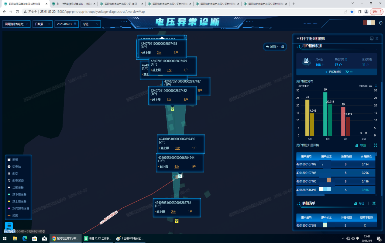 8月,國網(wǎng)湖北省荊州市供電公司全面推廣配網(wǎng)電壓異常診斷應(yīng)用。配電部、數(shù)字化部等多部門與基層迅速聯(lián)動,在11家單位、146個崗位部署應(yīng)用,一線人員通過自動生成的治理任務(wù),調(diào)整1372臺配變檔位、3242個用戶相別。例如公安甘廠松園2號公變長期B相電壓低,策略推薦將某B相用戶負載調(diào)節(jié)至C相,供電所執(zhí)行后,三相不平衡度由79%下降至46%,用戶最低電壓由190伏提升至210伏,有效驗證了策略可行性。截至7月,該公司全口徑用戶電壓指數(shù)達到99.019,同比提升0.806。