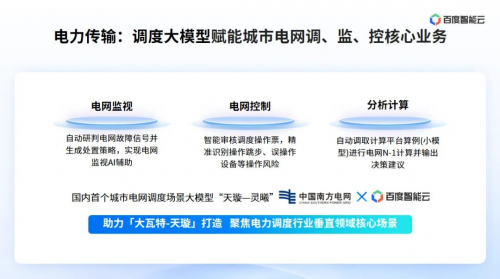 電力傳輸側(cè):今年5月份,百度智能云助力南網(wǎng)深圳供電局發(fā)布了國(guó)內(nèi)首個(gè)城市電網(wǎng)調(diào)度場(chǎng)景大模 天璇 — 靈曦”,它是基于南網(wǎng)“大瓦特—天璇”電力調(diào)度大模型底座搭建的,可實(shí)現(xiàn)自動(dòng)研判故障、生成處置策略、智能審核調(diào)度操作票以及調(diào)取算例進(jìn)行N-1計(jì)算,已經(jīng)投入電網(wǎng)調(diào)度生產(chǎn)業(yè)務(wù)并發(fā)揮了實(shí)效。