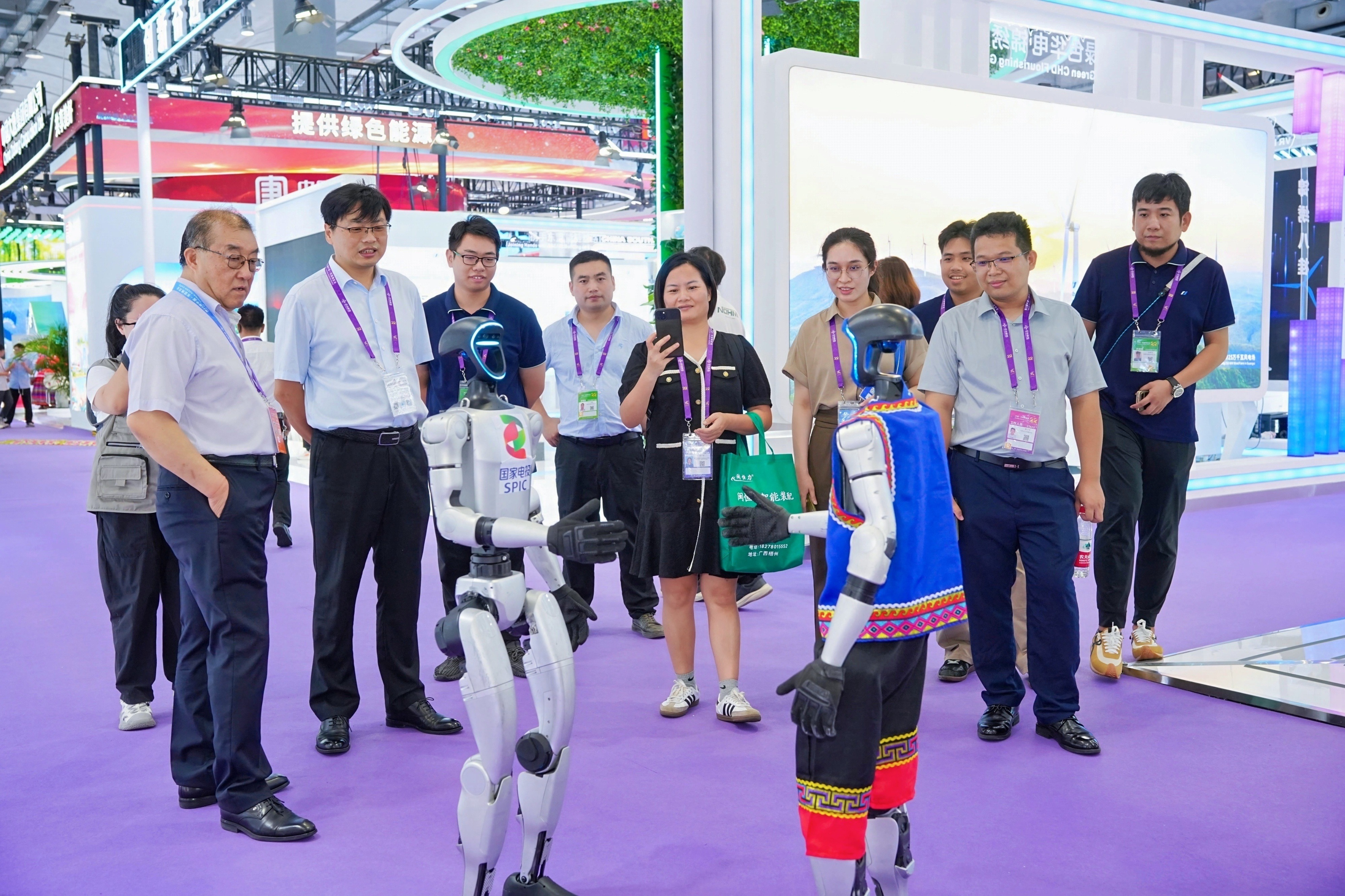 展會期間,國家電投集團(tuán)展區(qū)準(zhǔn)備了“國和一號”模型、“氫騰”大巴模型、定制冰箱貼等多種富有企業(yè)特色的文創(chuàng)禮品。展臺上的人形機(jī)器人與機(jī)器狗,在現(xiàn)場踏步奔走、翻轉(zhuǎn)揮手,觀眾紛紛舉起手機(jī)拍攝,成為全場“顯眼包”。身穿壯族特色服飾的工作人員,在每天10時(shí)和15時(shí)組織開展兩場AI趣文創(chuàng)“隔空抓娃娃”活動,吸引眾多觀眾排起“長龍”駐足參與。觀眾在風(fēng)力發(fā)電等科技互動體驗(yàn)中深入了解國家電投集團(tuán)在清潔能源、科技創(chuàng)新等方面的成果以及國家電投在桂綠色發(fā)展的顯著成效。