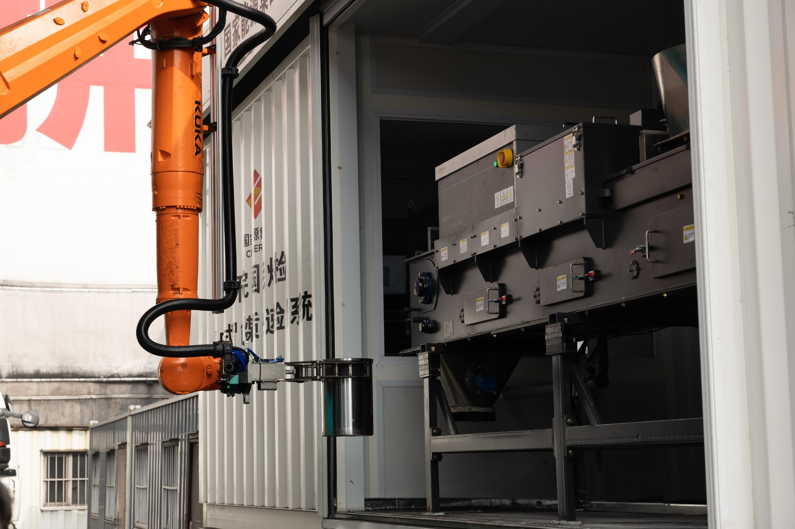 該系統(tǒng)檢測流程全自動化運行,移動采樣車抵達離線快檢區(qū)域后,通過無線接入點發(fā)送車輛車牌信息及采樣信息等數(shù)據(jù)至系統(tǒng),信息核驗無誤后道閘開啟,車輛駛?cè)肟鞕z站進行檢測,翼展門與離線快檢系統(tǒng)卷簾門同步打開;機械臂先確定高度再換夾具夾取樣桶投樣,投樣、取樣動作重復3次以保障檢測結(jié)果的準確性,單個樣品檢測約20分鐘,多樣品并行平均耗時15分鐘,結(jié)果實時同步輸出。