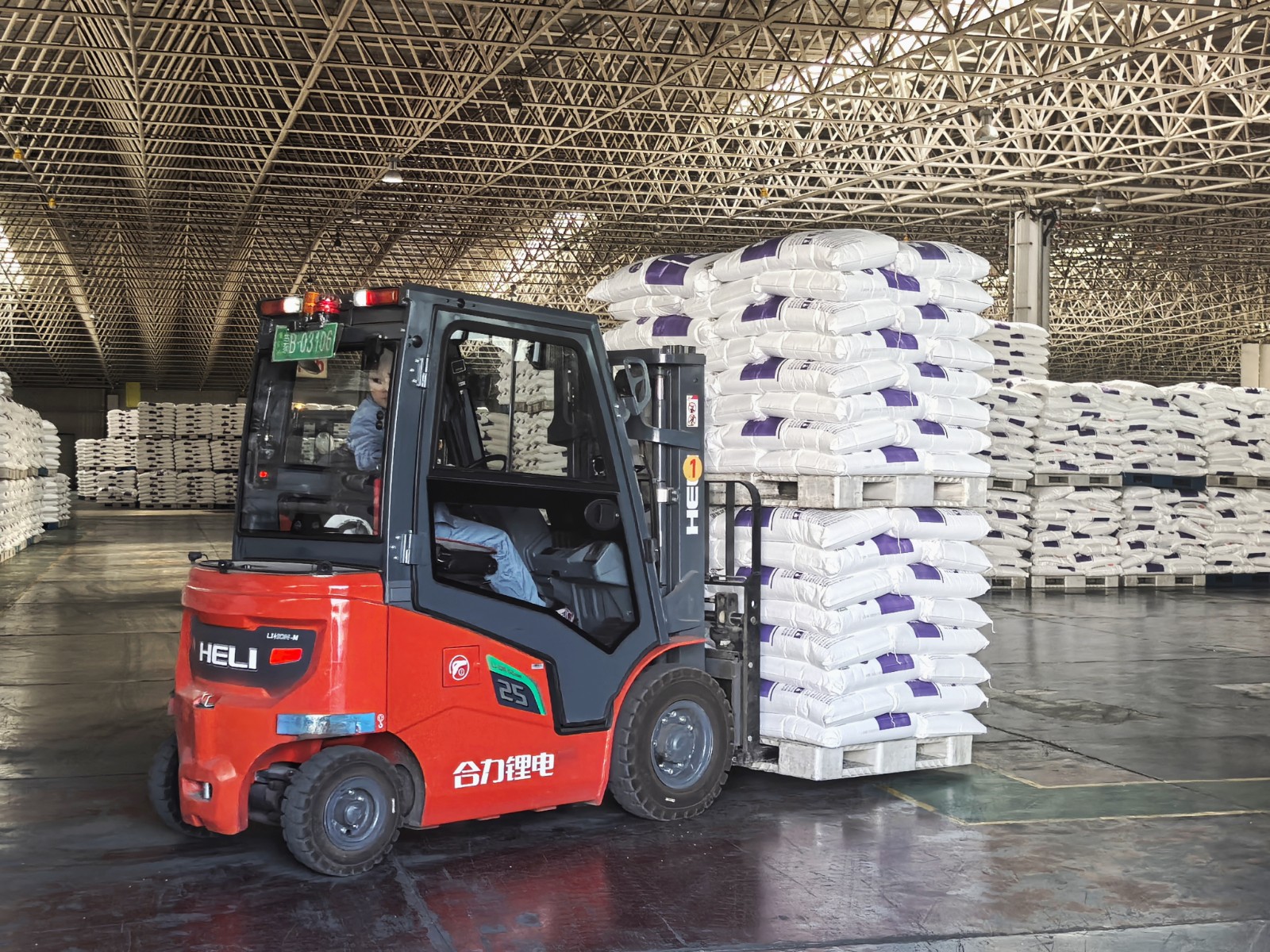 圖為正在聚烯烴產(chǎn)品倉(cāng)庫(kù)搬運(yùn)