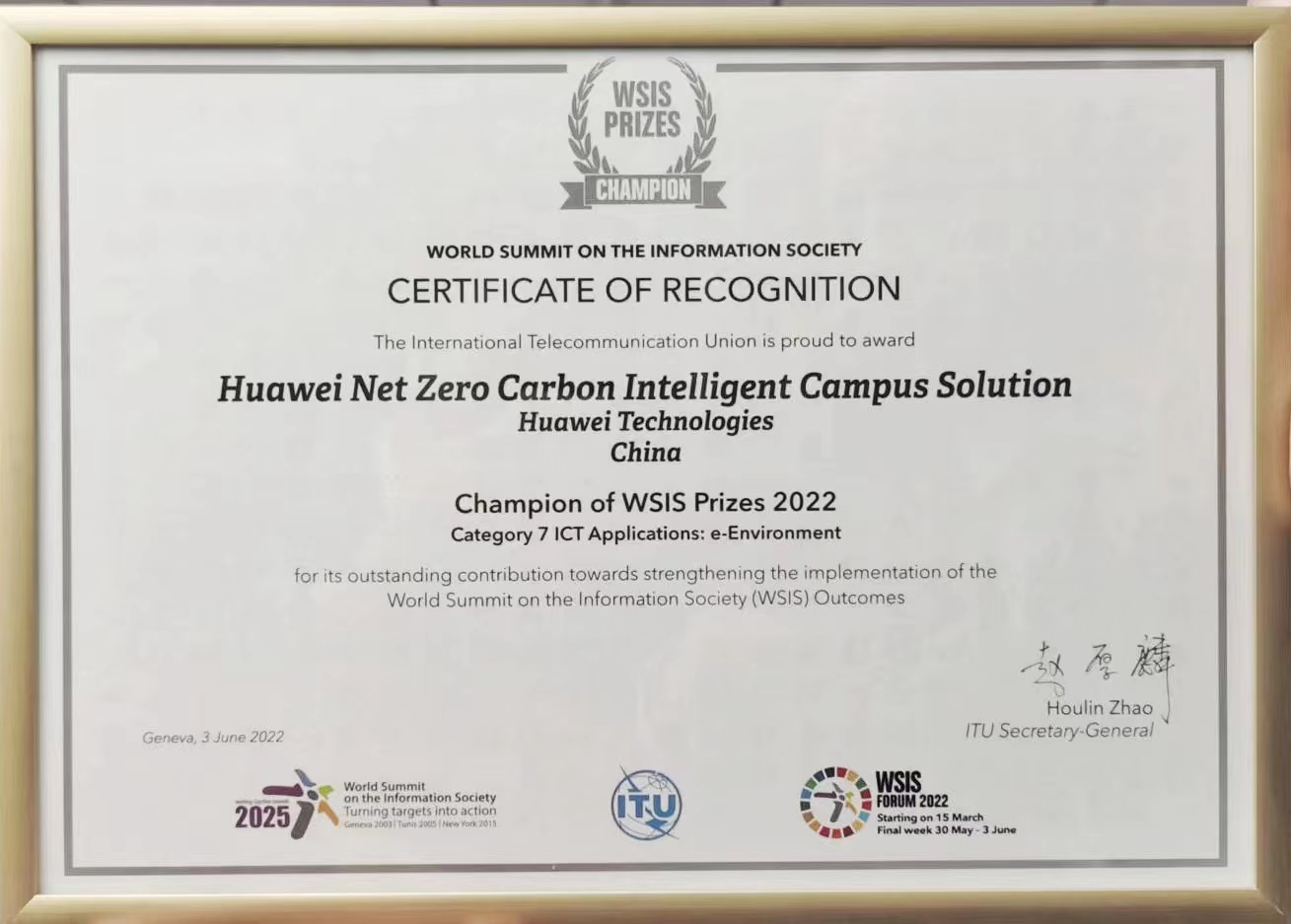 圖為榮獲WSIS2022冠軍獎(jiǎng),華為獲獎(jiǎng)證書(shū)。