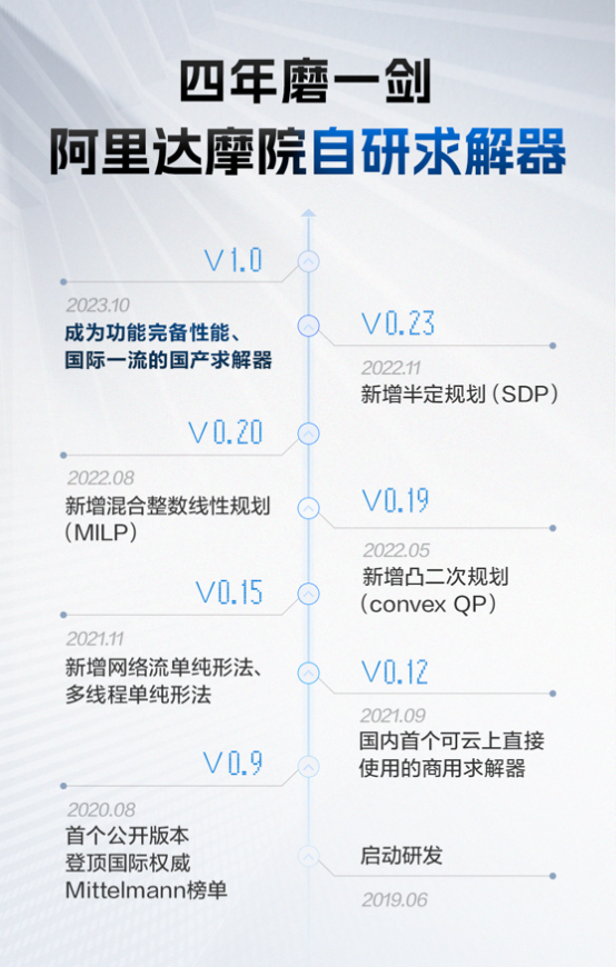 據(jù)了解,阿里達(dá)摩院決策智能實(shí)驗(yàn)室在國(guó)際知名數(shù)學(xué)家印臥濤帶領(lǐng)下,自2019年起就致力于求解器研發(fā),從零起步,經(jīng)歷四年、迭代26個(gè)版本,終于在2023年10月正式推出V1.0版本,成為功能完備、性能領(lǐng)先的自研求解器。目前,達(dá)摩院求解器已能求解包括線性規(guī)劃、混合整數(shù)線性規(guī)劃、大規(guī)模網(wǎng)絡(luò)流、凸二次規(guī)劃、半定規(guī)劃、非線性規(guī)劃在內(nèi)的主流優(yōu)化問(wèn)題,并且具備針對(duì)聚焦領(lǐng)域的AI加速能力。