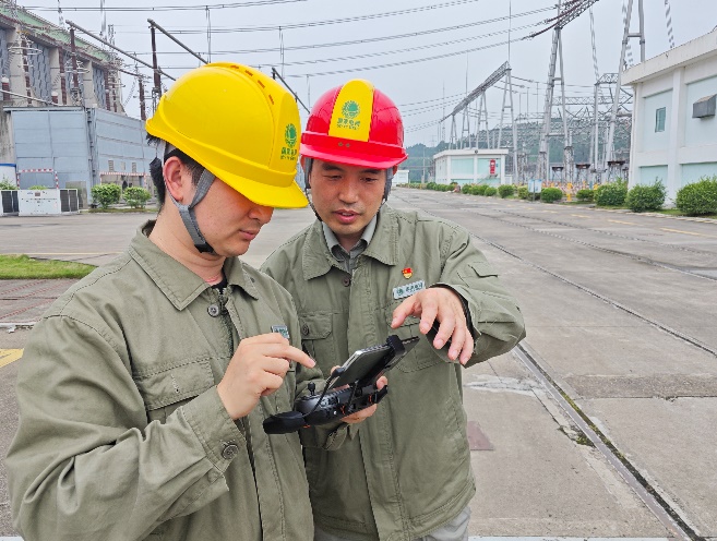 龍泉換流站站長吳衛(wèi)和值班員謝智遠在使用無人機進行巡視。余馨瑤攝
