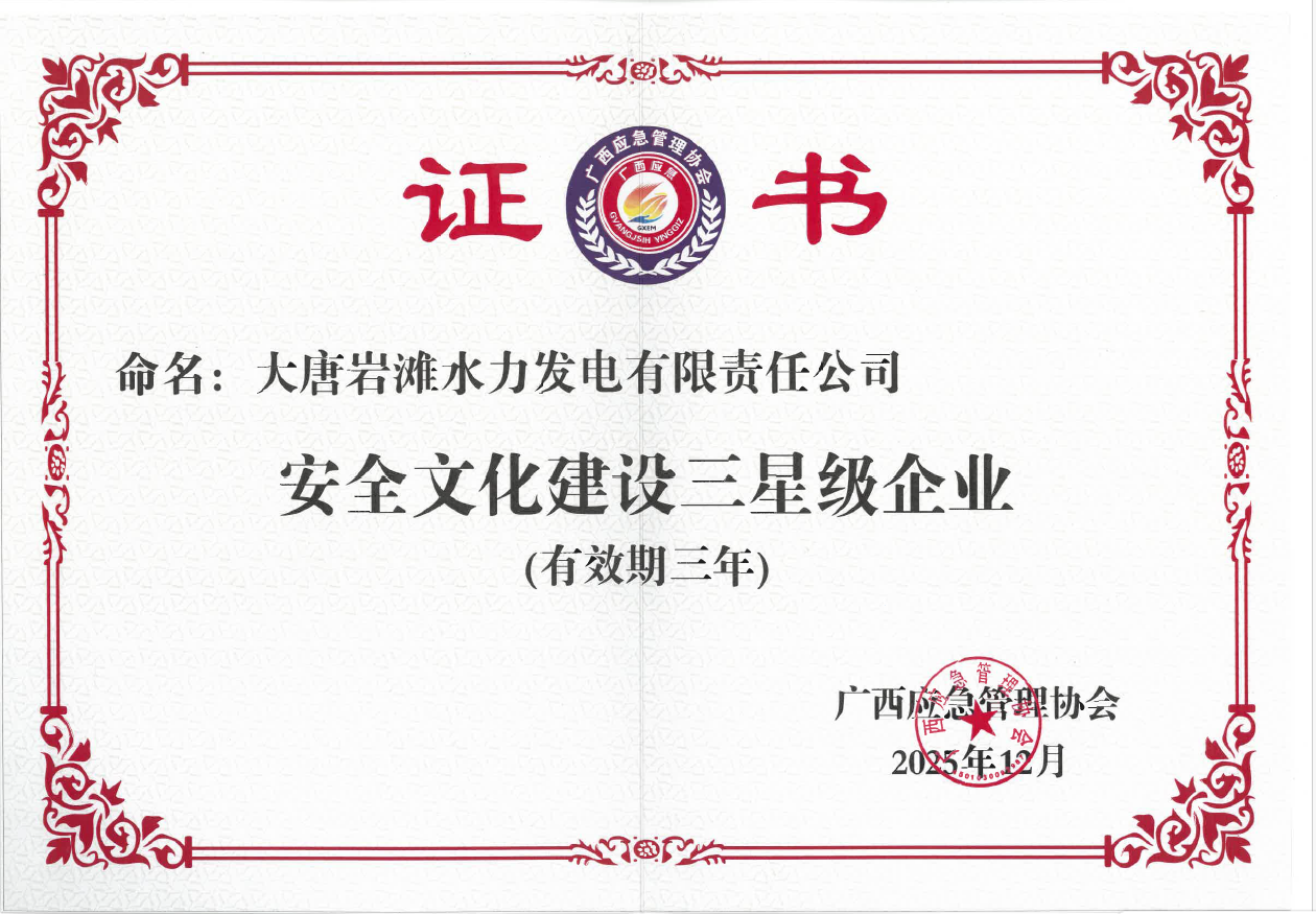 2025年1月9日,大唐巖灘水力發(fā)電有限責(zé)任公司(簡稱“巖灘水電公司”)捧回了榮譽(yù)證書。憑借扎實(shí)過硬的安全管理成效,經(jīng)廣西應(yīng)急管理協(xié)會(huì)嚴(yán)格評(píng)審,該公司正式被命名為“安全文化建設(shè)三星級(jí)企業(yè)”,躋身廣西首批獲此殊榮的水電企業(yè)。