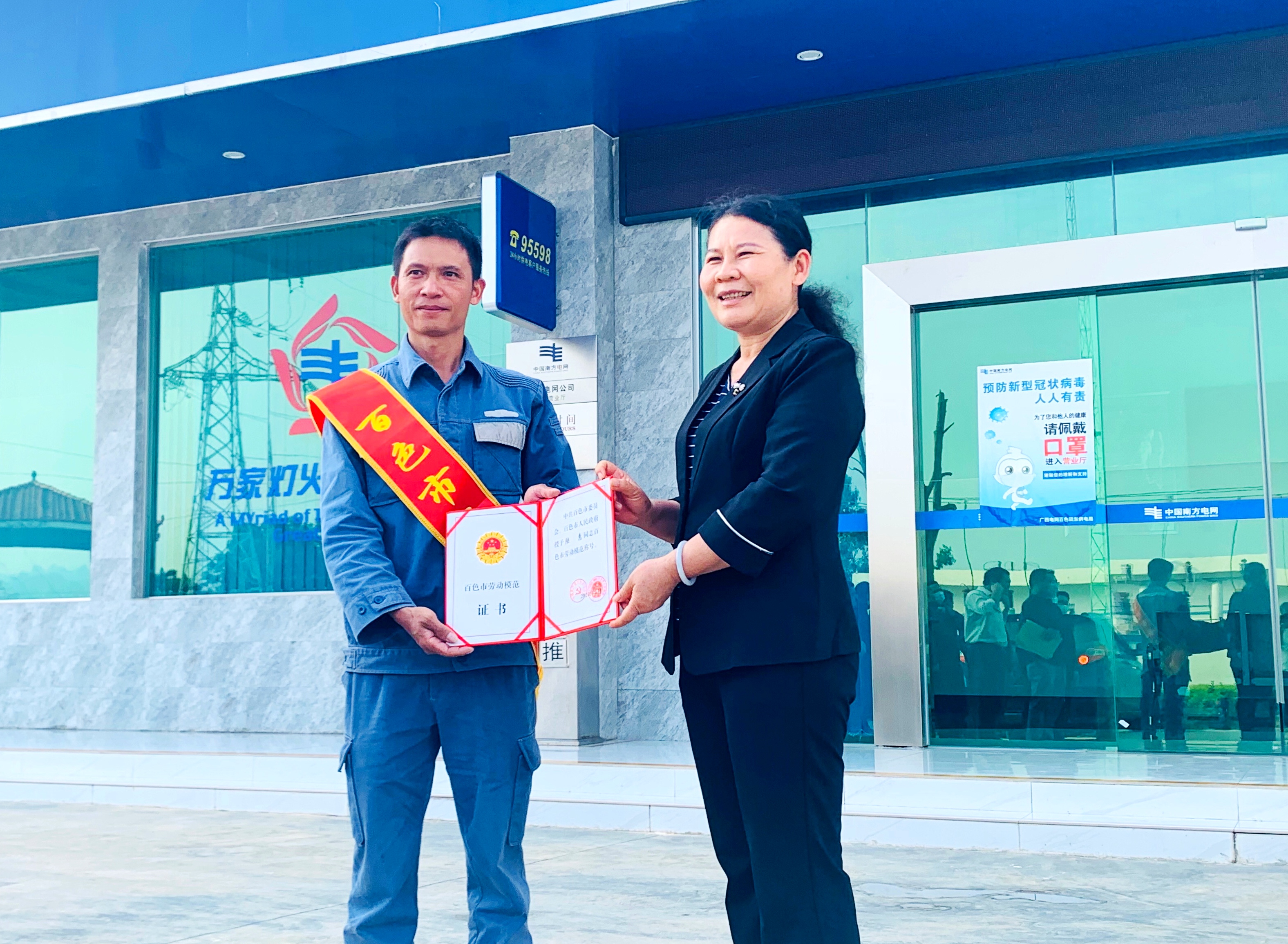 田東縣總工會主席黃秀斌為陸惠頒發(fā)榮譽證書。