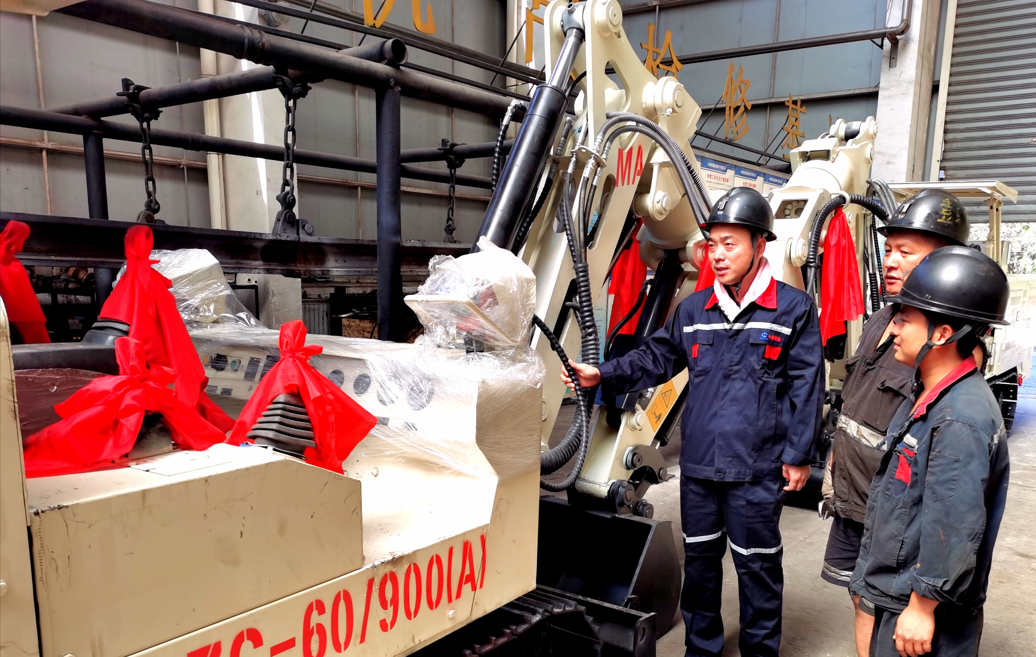 圖為:杜軍(左一)正在為職工講授井下臥底機(jī)的操作方法