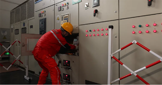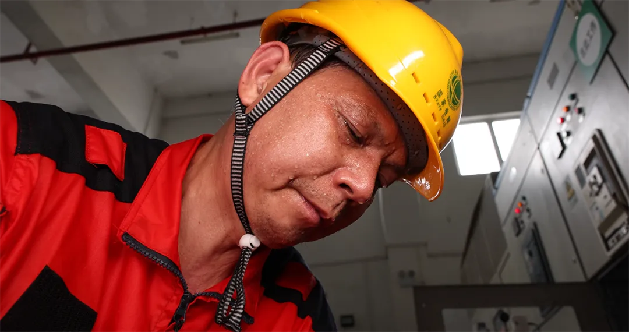 繞過兩排配電柜,映入眼簾的是兩排整齊的安全圍欄。圍欄中央的“在此工作”標(biāo)識(shí)牌后,一個(gè)人正頭戴安全帽,扎著馬步,弓身抬頭,一手拿著工具,另一只手在配電柜內(nèi)忙碌著。被汗水浸濕的工作服緊貼在身上,顯露出他結(jié)實(shí)的肌肉線條。