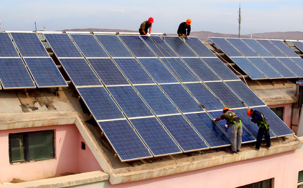 現(xiàn)場工作人員正在檢修屋頂光伏板